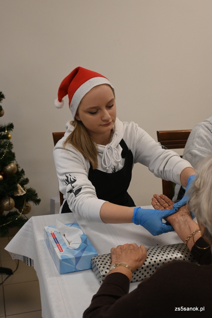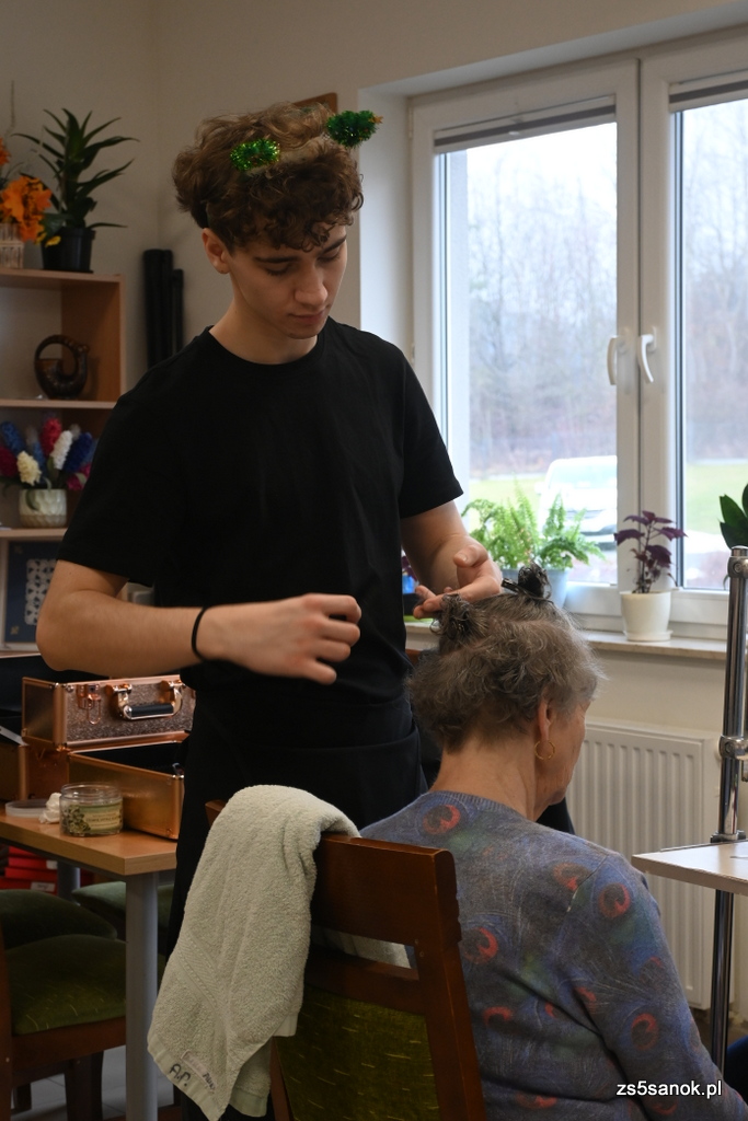 2 A-Dawid,3 Tb-Ania i Sandra, 5 Tz —Monika,Julia,Wiktoria,Emilka,Natalia z dużą empatią i zaangażowaniem wykonywali usługi fryzjersko-kosmetyczne. Podopieczni ośrodka DPS w Sanoku mogli się przygotować do spotkania z Mikołajem oraz zbliżających się Świąt Bożego Narodzenia.