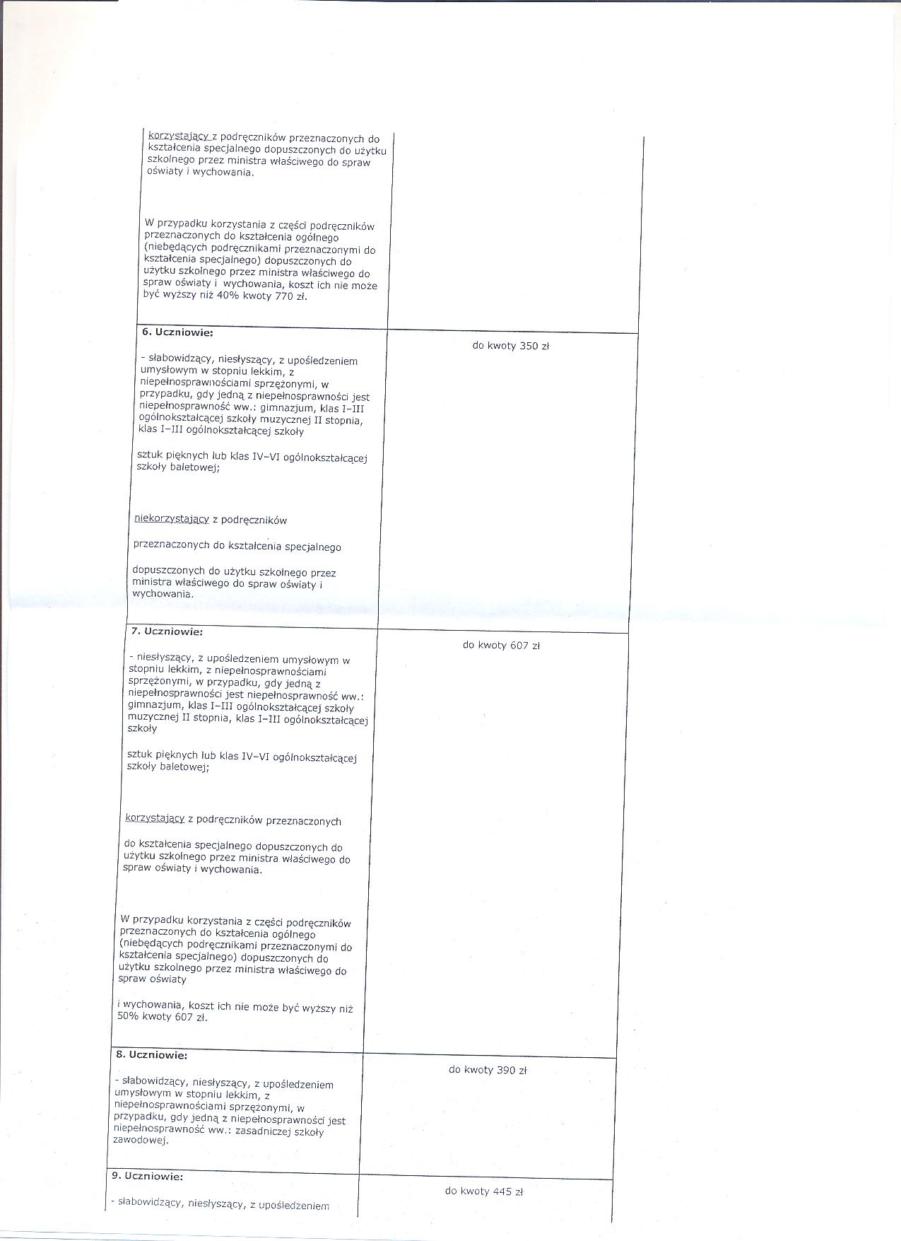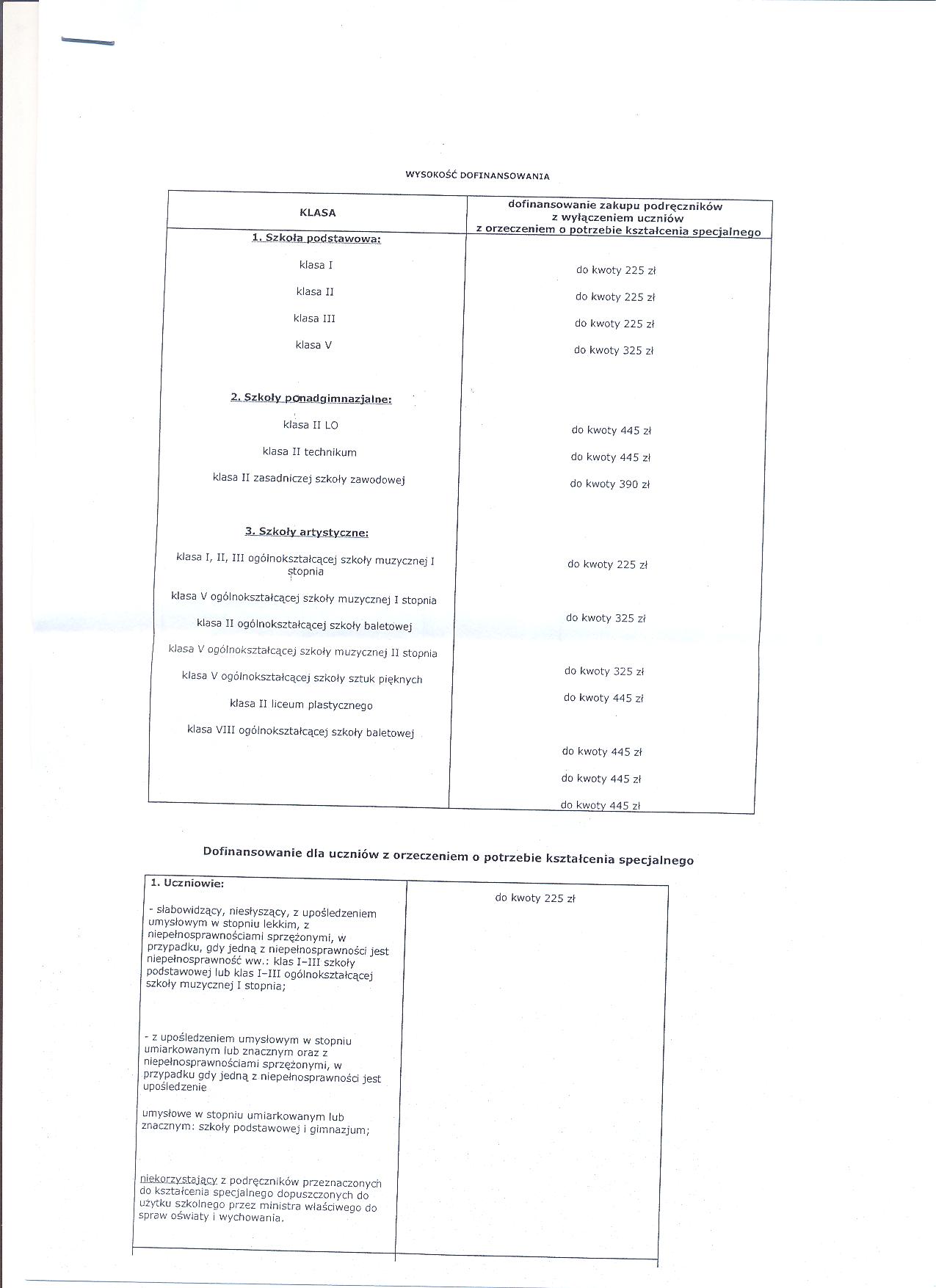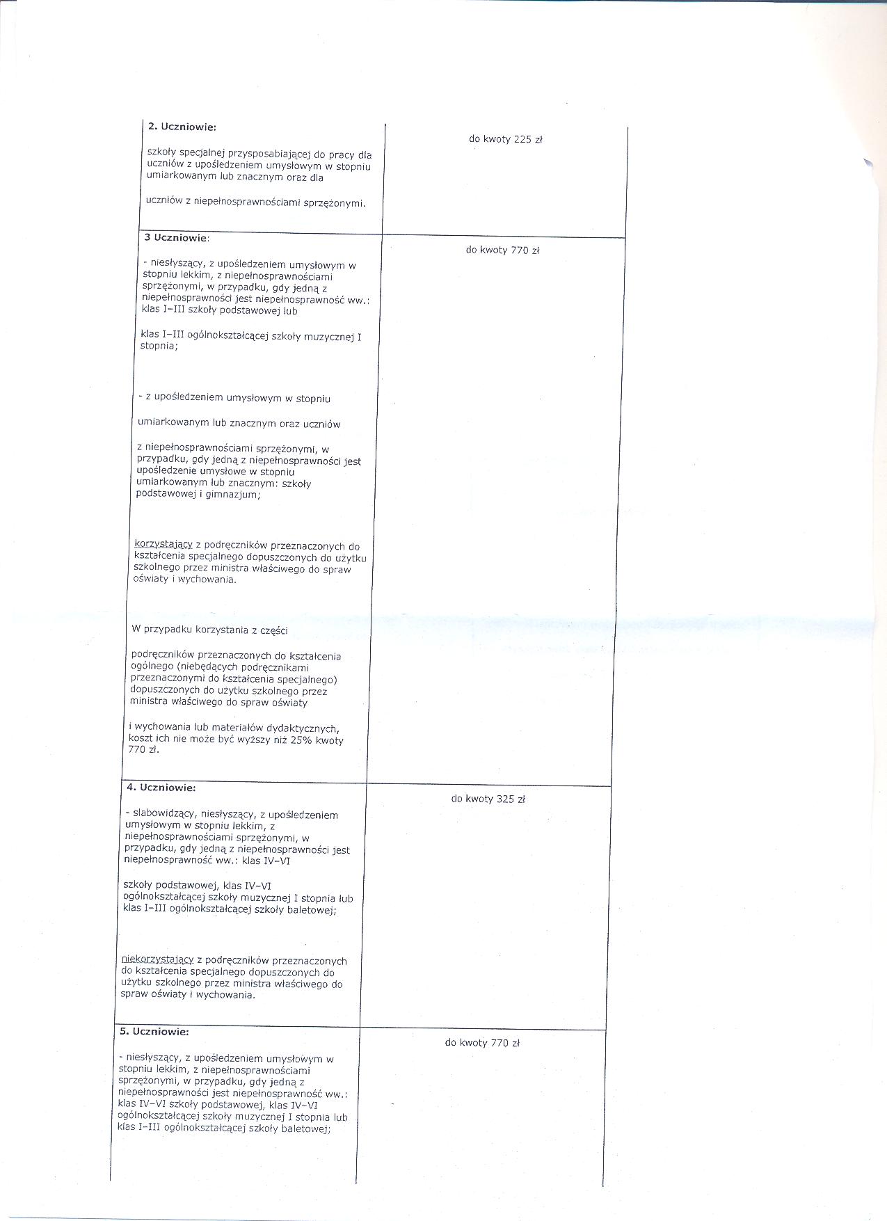- w przypadku ubiegania się o pomoc dla ucznia niepełnosprawnego (słabowidzacego, niesłyszącego, z upośledzeniem umysłowymw stopniu lekkim, z upośledzeniem umysłowym w stopniu umiarkowanym lub znacznym, z niepełnosprawnościami sprzężonymi, gdy jedna z niepełnosprawności jest niepełnosprawność wymieniona wyżej) do wniosku- zamiast zaświadczenia o wysokości dochodów - należy dołączyć kserokopię orzeczenia o potrzebie kształcenia specjalnego wydanego przez publiczną poradnię psychologiczno - pedagogiczna, w tym poradnię specjalistyczną,