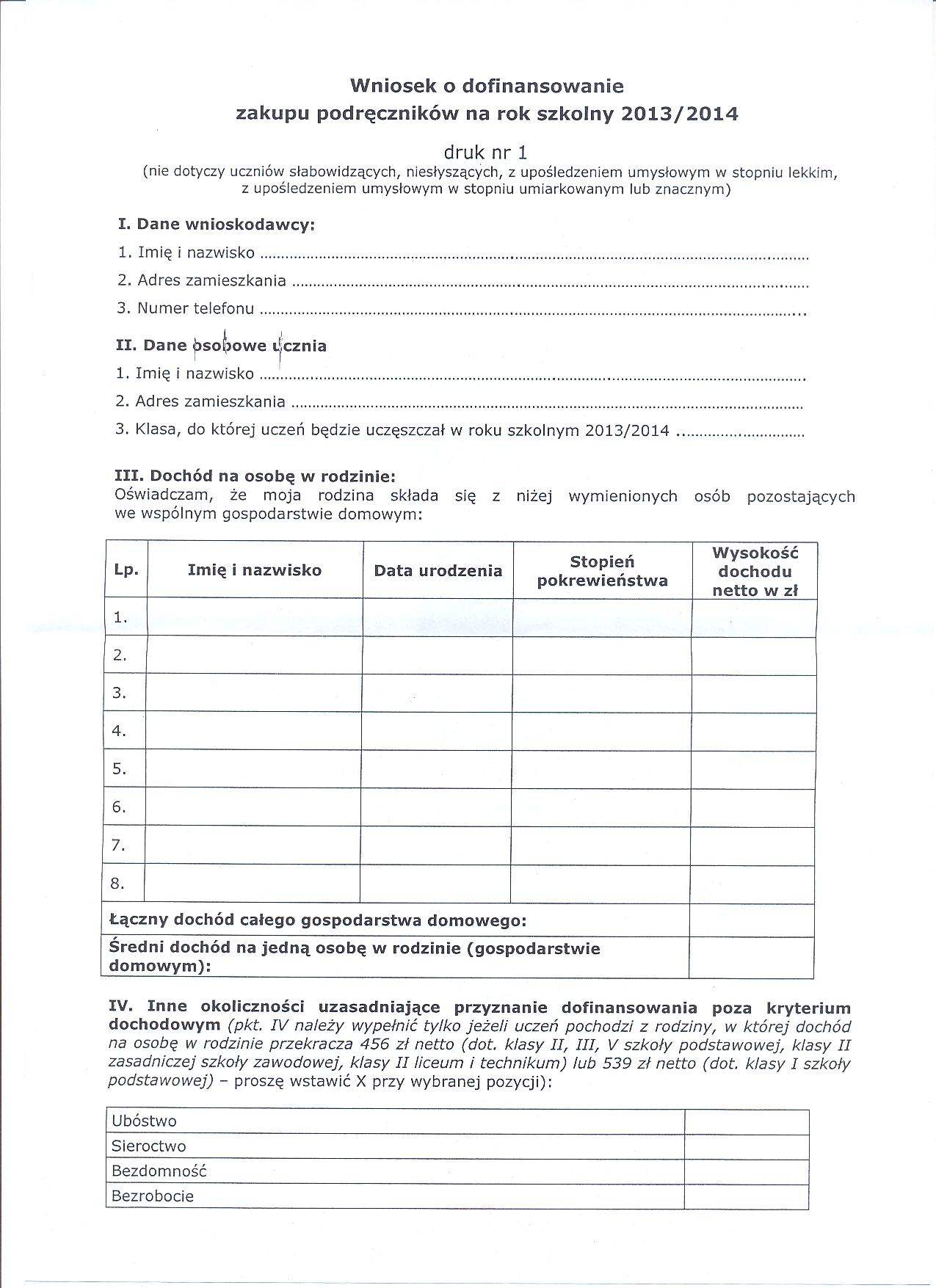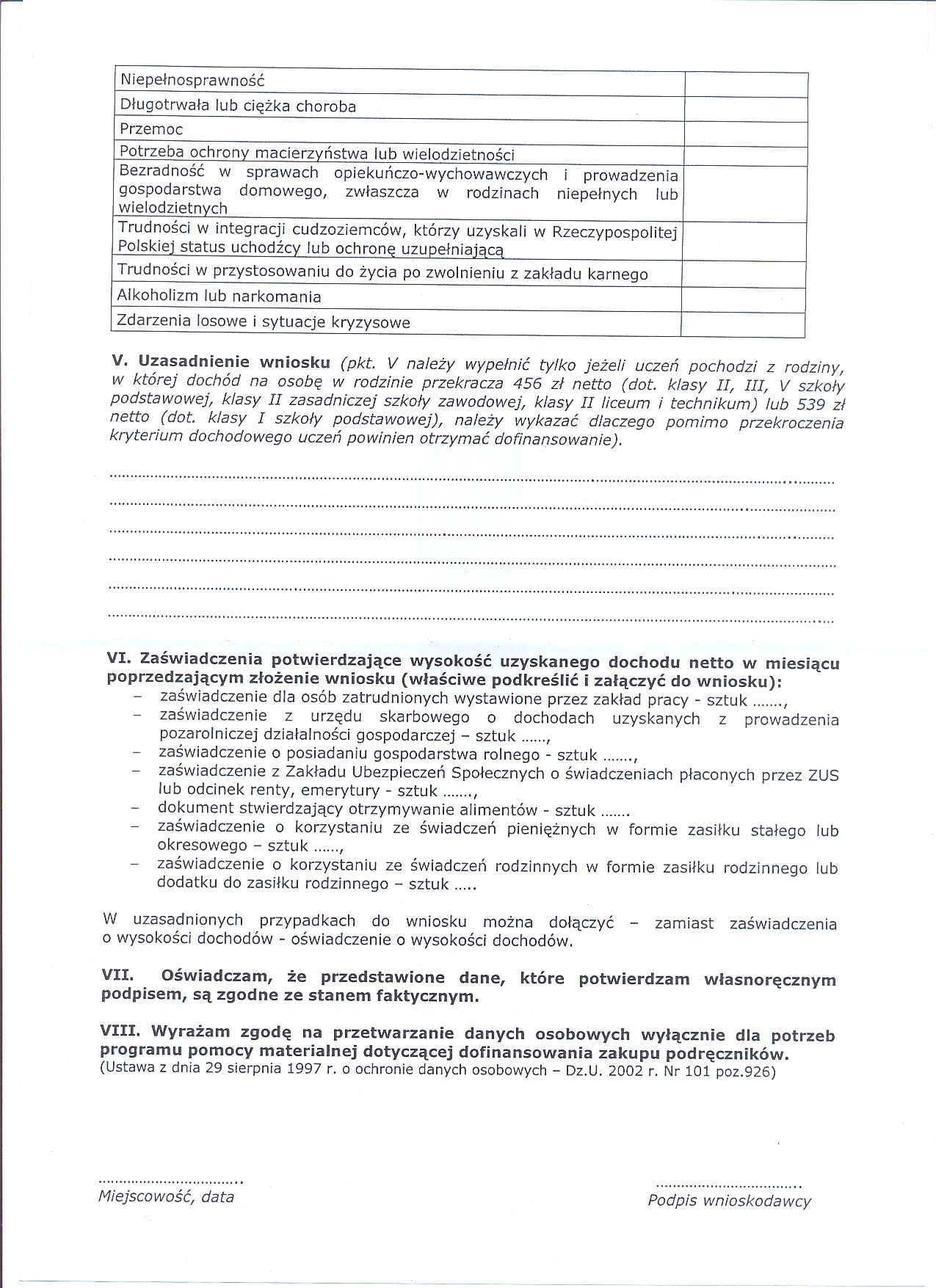 - w przypadku ubiegania się o pomoc ucznia, którego rodzina znajduje się w trudnej sytuacji życiowej i dochód na osobę w rodzinie przekracza kryterium dochodowe - zamiast zaświadczenia o wysokości dochodów - należy dołączyć uzasadnienie.