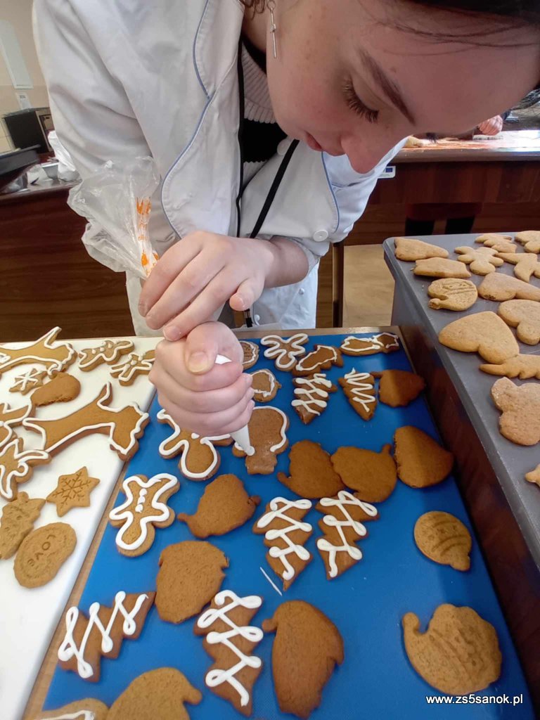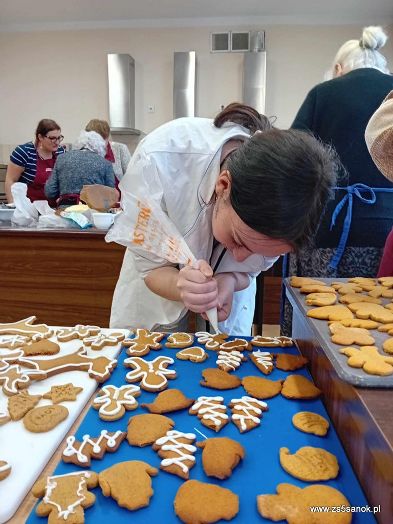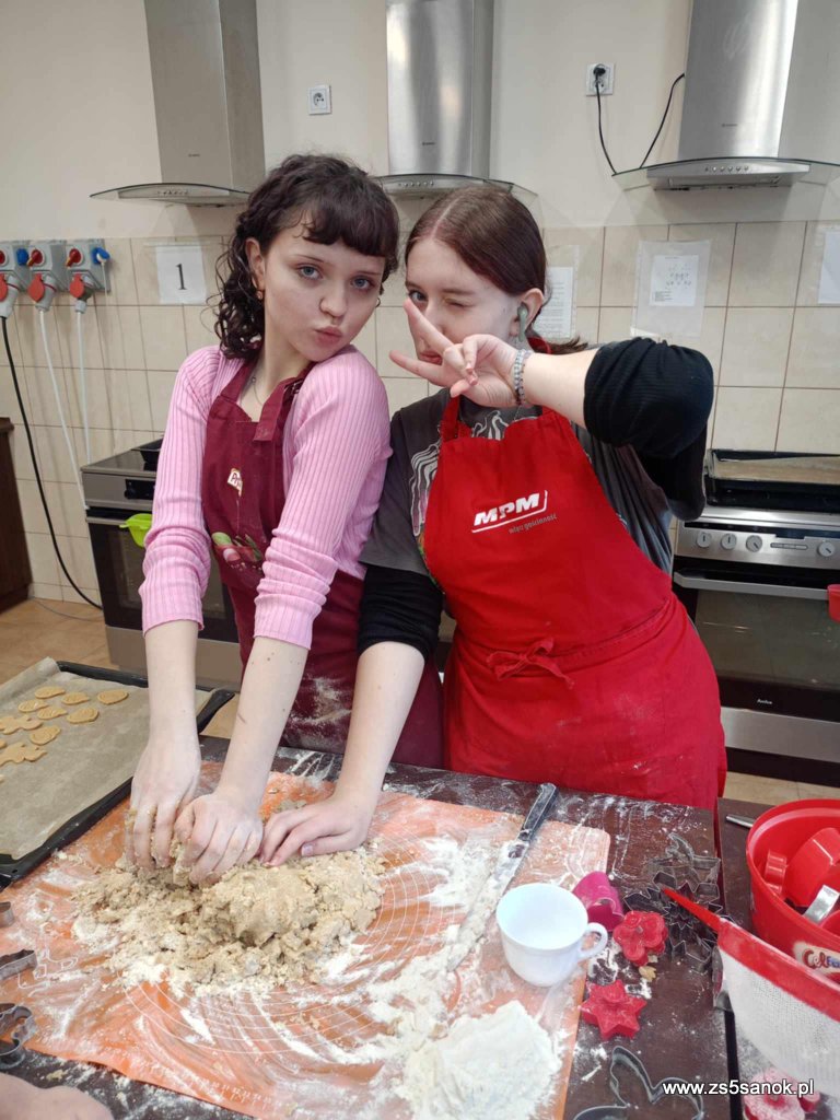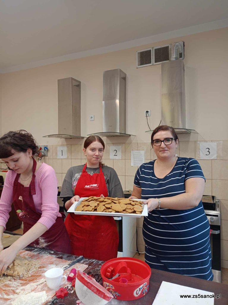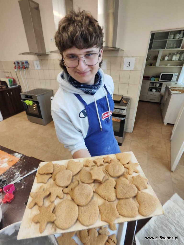W dniu 4 grudnia 2024 uczniowie naszej szkoły wraz z paniami seniorkami piekli pierniki w ramach projektu społecznego "Wspólne pieczenie kształci pokolenie". Pierniki sprzedawane będą podczas Turnieju Charytatywnego, a cały dochód przekazany zostanie na rehabilitację i leczenie dla Konrada. Projekt realizowany jest w ramach ogólnopolskiej olimpiady Zwolnieni z Teorii a jego celem jest zorganizowanie warsztatów kulinarnych dla seniorów oraz młodzieży.