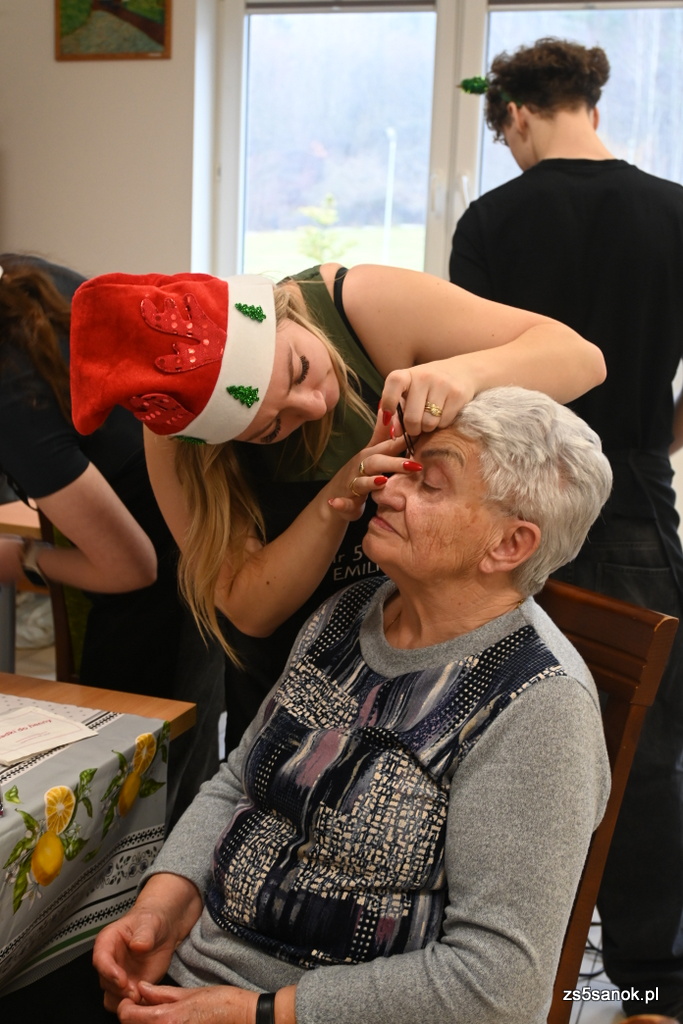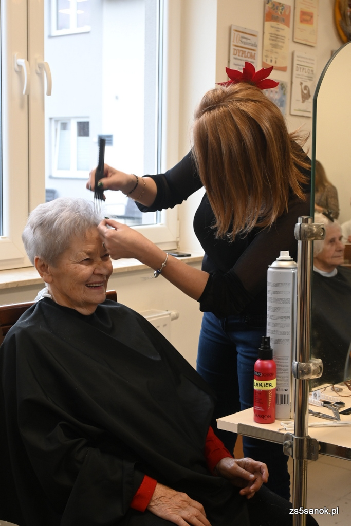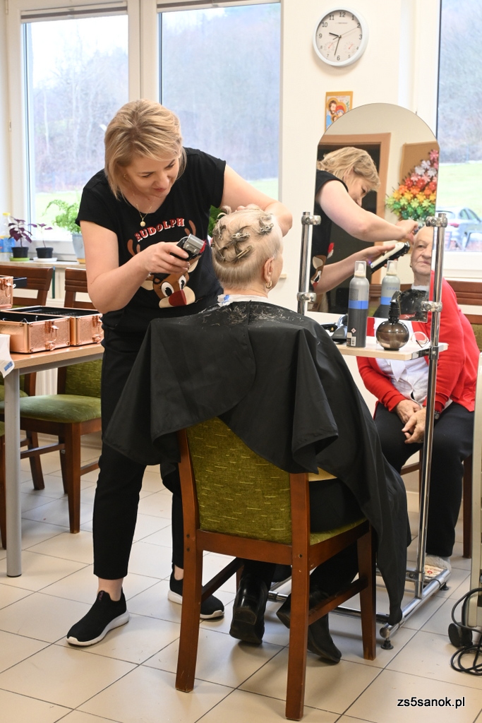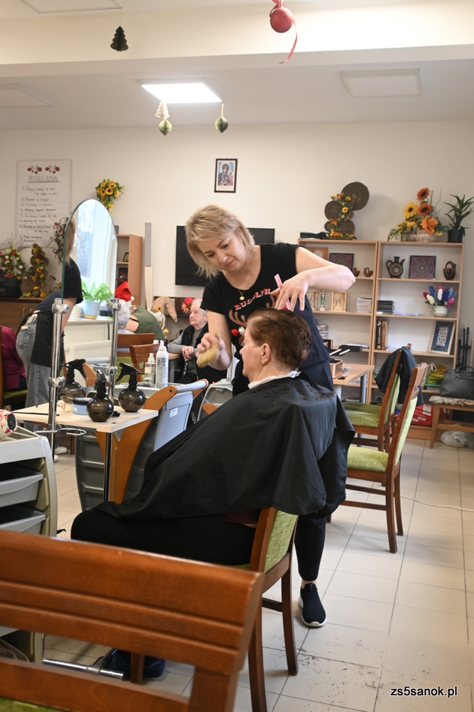 2 A-Dawid,3 Tb-Ania i Sandra, 5 Tz —Monika,Julia,Wiktoria,Emilka,Natalia z dużą empatią i zaangażowaniem wykonywali usługi fryzjersko-kosmetyczne. Podopieczni ośrodka DPS w Sanoku mogli się przygotować do spotkania z Mikołajem oraz zbliżających się Świąt Bożego Narodzenia.