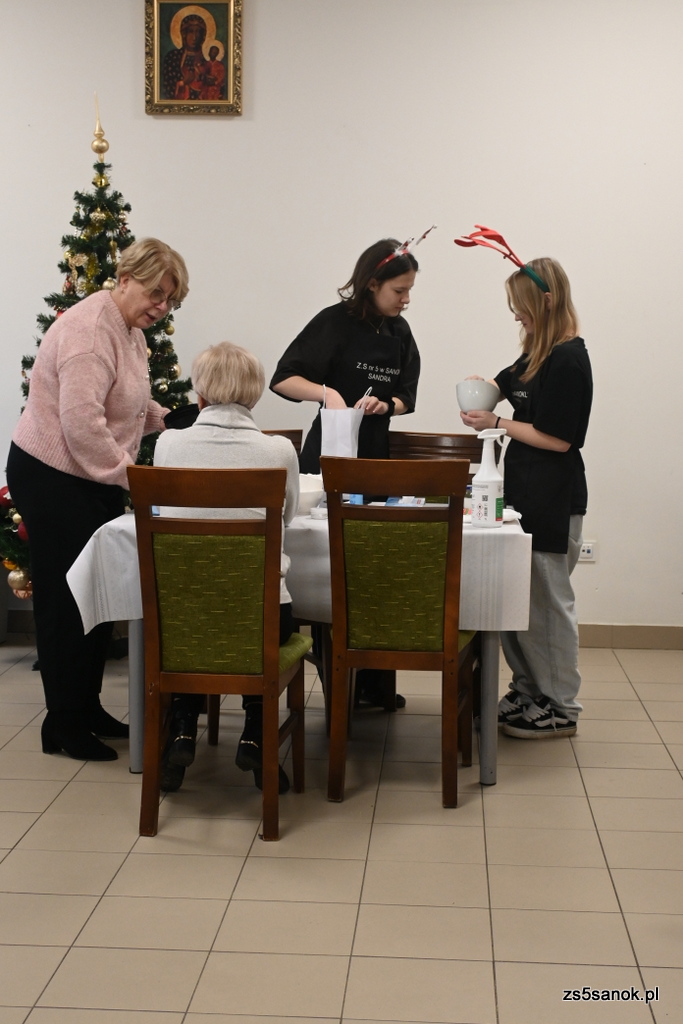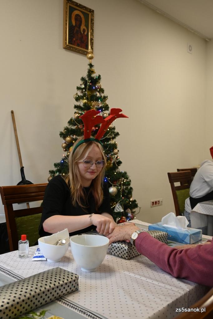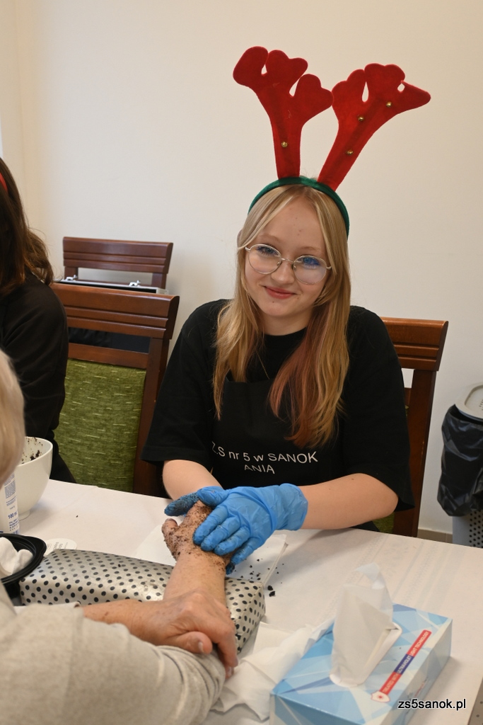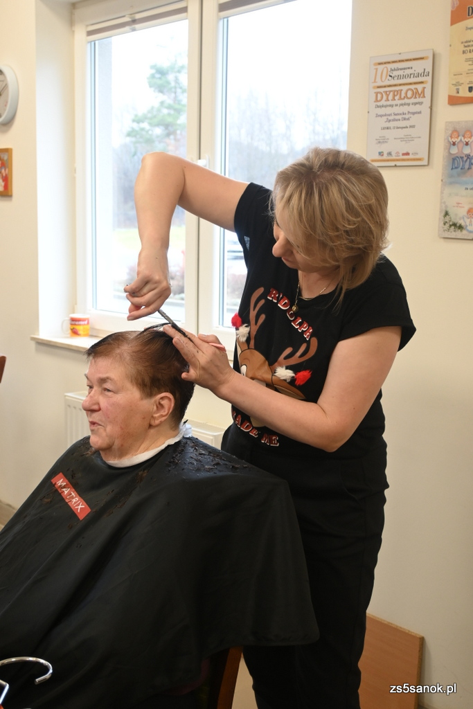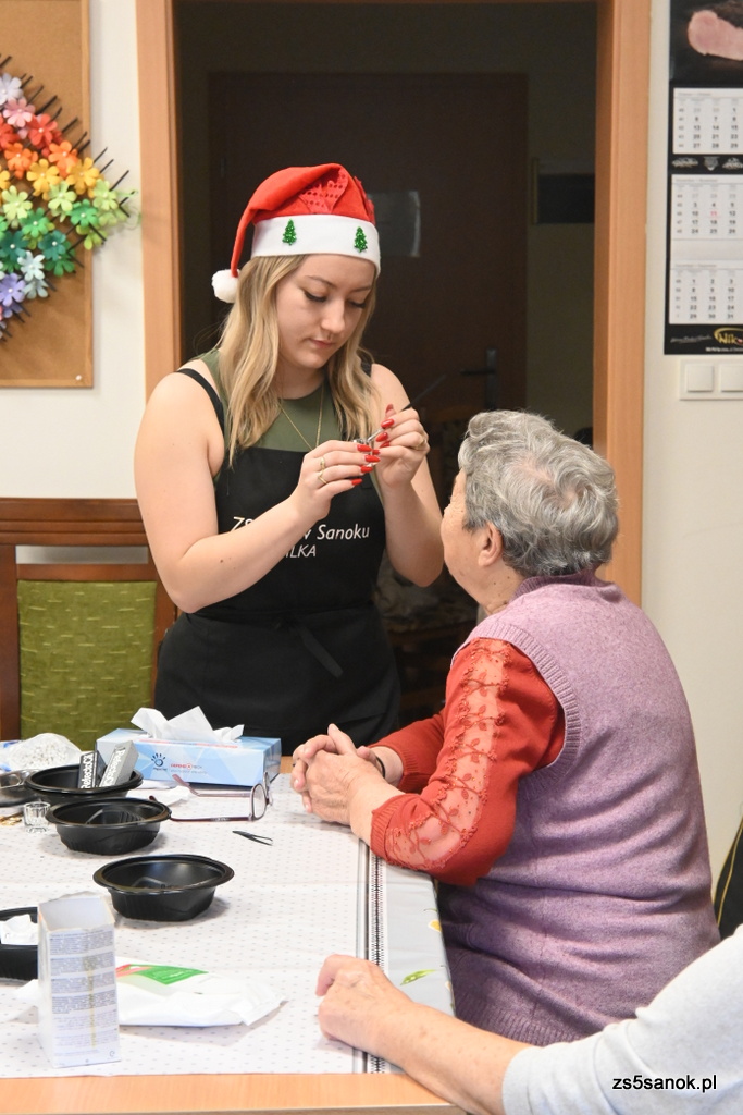 2 A-Dawid,3 Tb-Ania i Sandra, 5 Tz —Monika,Julia,Wiktoria,Emilka,Natalia z dużą empatią i zaangażowaniem wykonywali usługi fryzjersko-kosmetyczne. Podopieczni ośrodka DPS w Sanoku mogli się przygotować do spotkania z Mikołajem oraz zbliżających się Świąt Bożego Narodzenia.